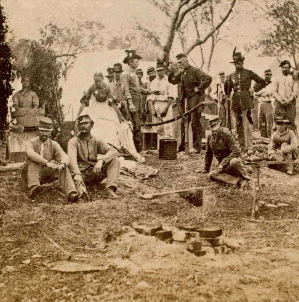 A captivating image shows Laundress and her children amidst soldiers. Before battles, she faced the immense challenge of preparing the men’s uniforms, a testament to her resilience and the harsh realities of camp life.